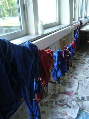 eine Wäscheleine voll frisch gebatikten T-shirts, Socken uä :D